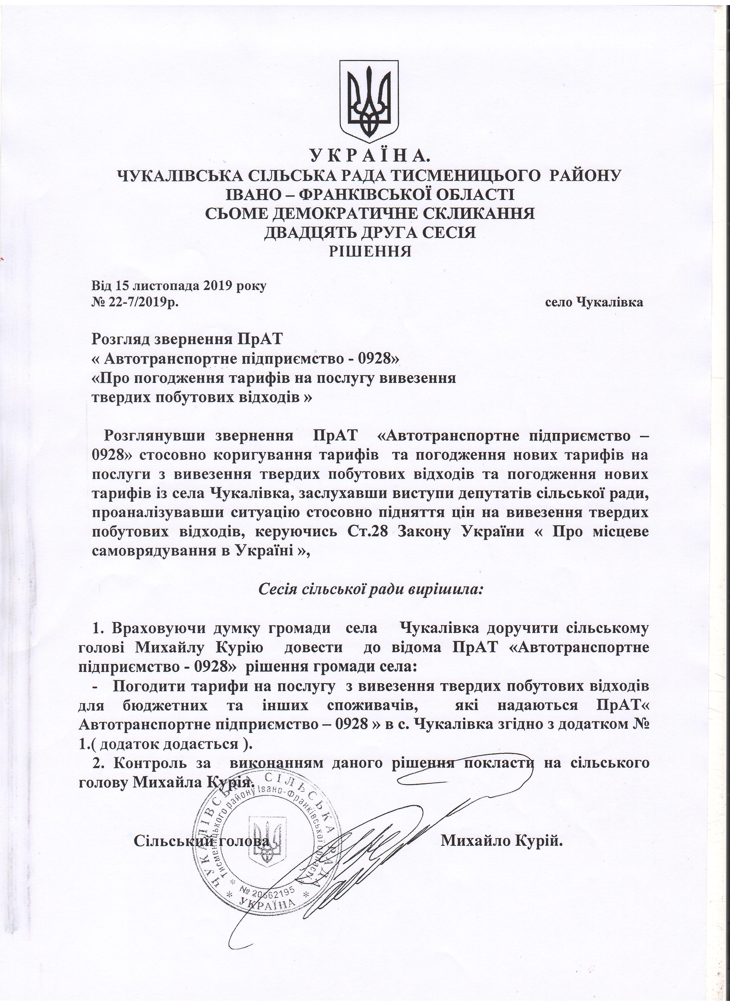 Відповідно до рішення Чукалівської сільської ради від 15.11.2019р № 22-7/2019р.